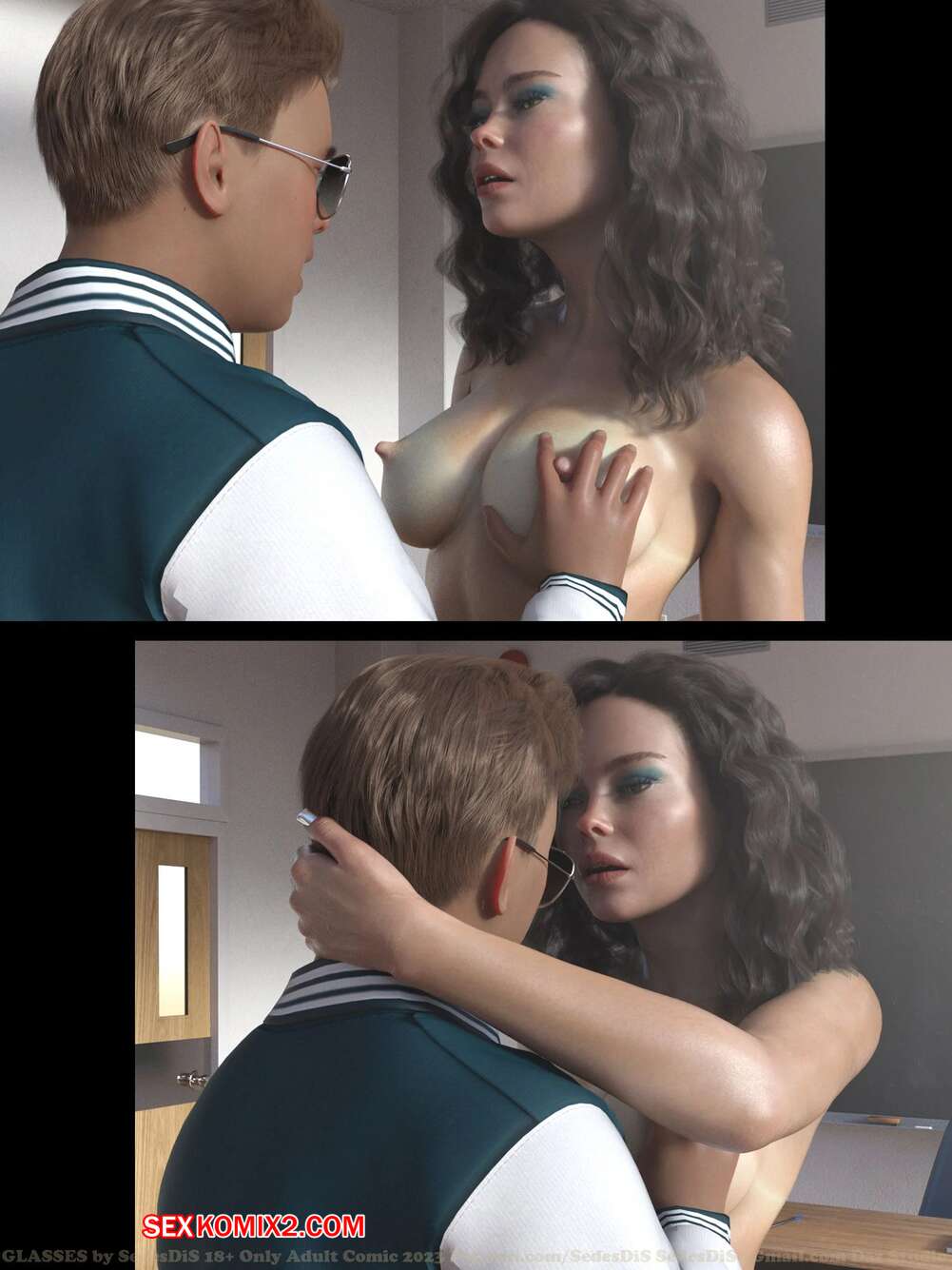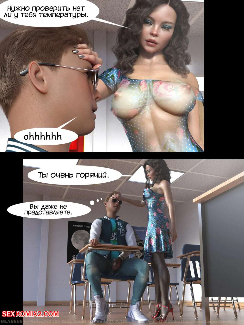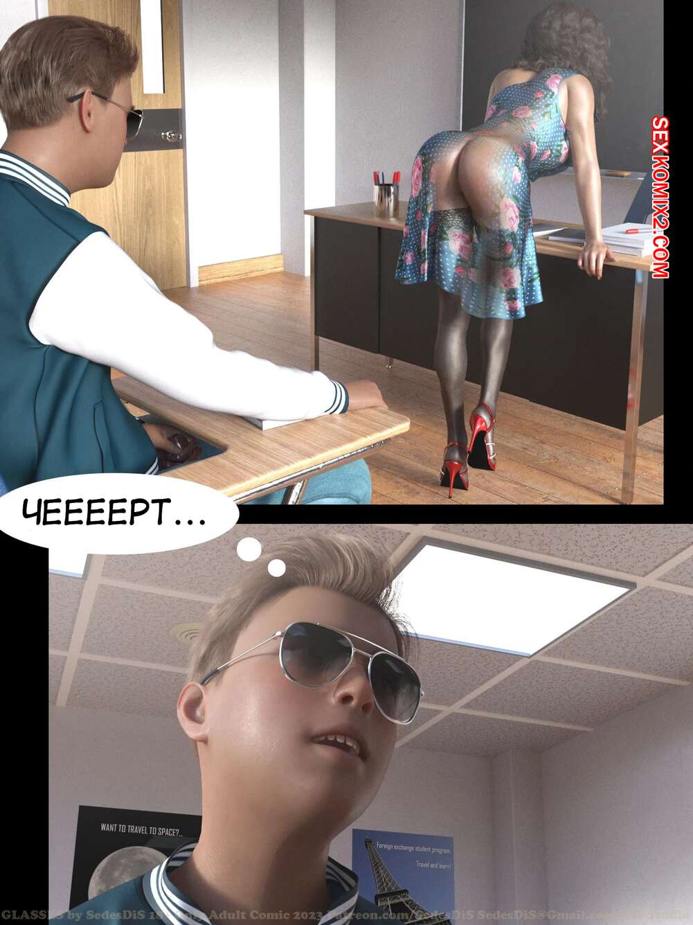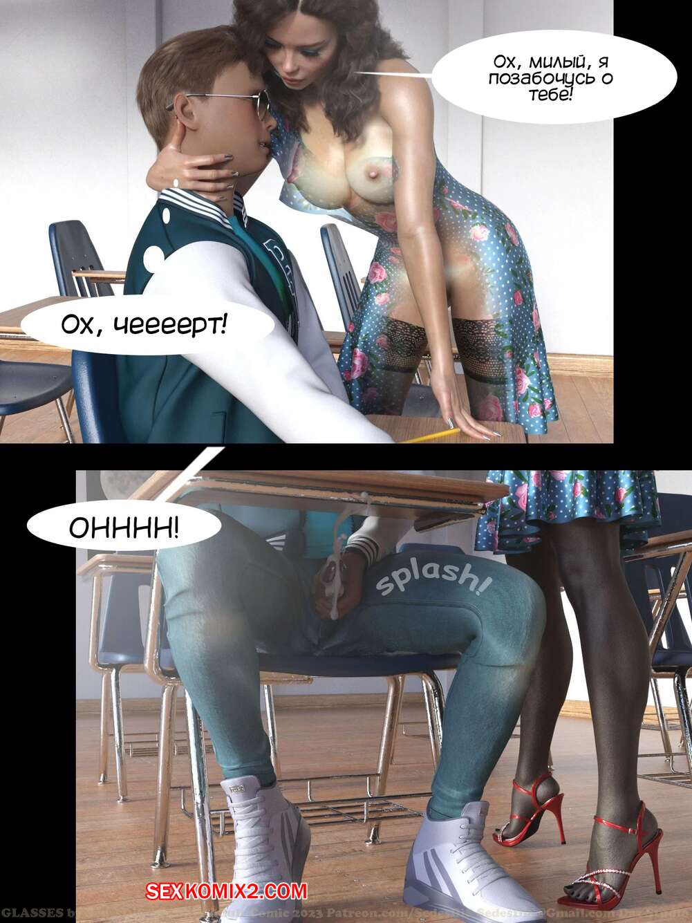 Порно комикс Очки. Часть 1. Glasses. SedesDiS. Парень остался после уроков у сексуальной училки и стал на нее смотреть в очках, которые позволили ему увидеть красокту голой. Училка спалила стояк парня, от чего она возбудилась и дала парню себя выебать.
