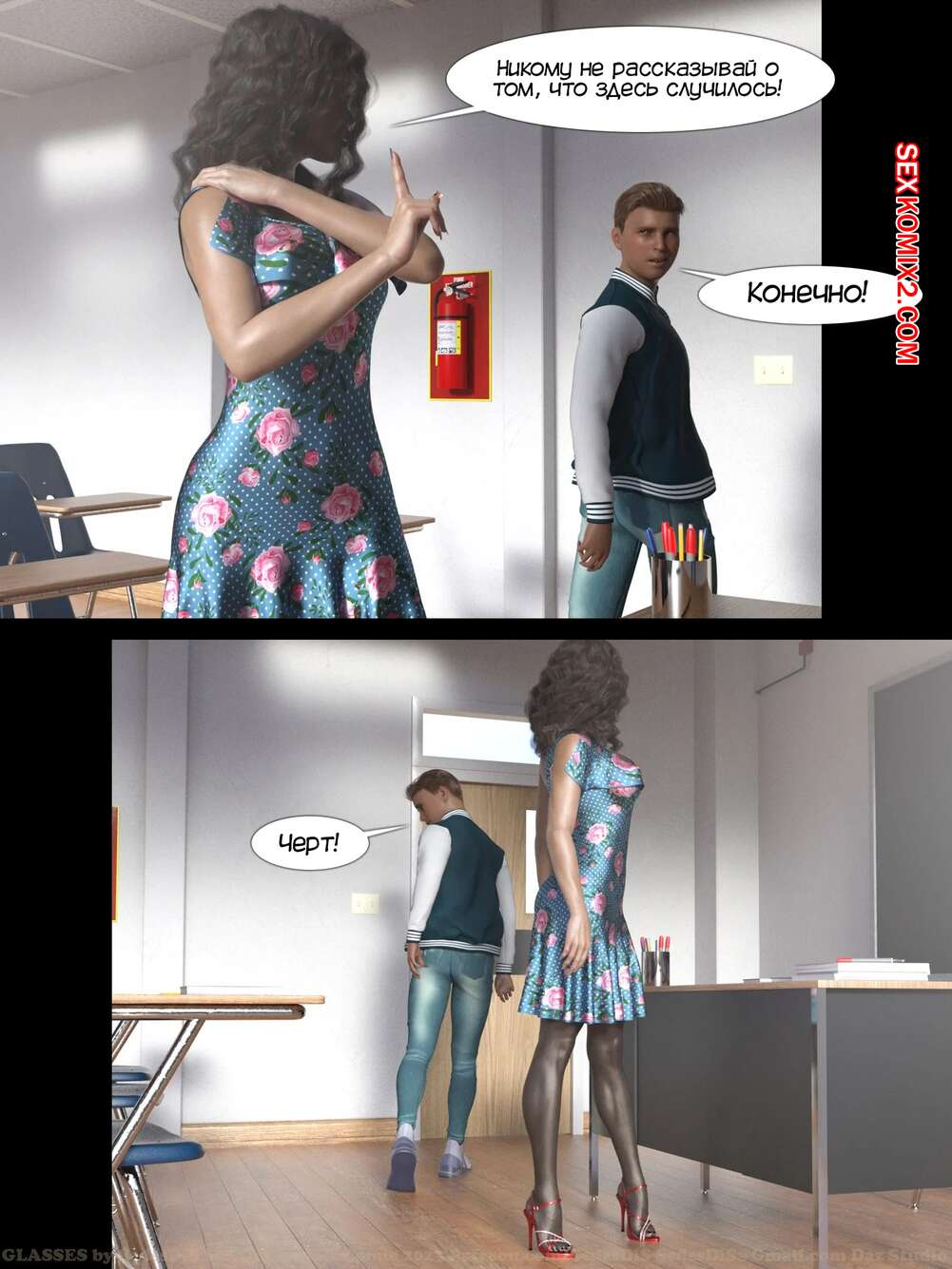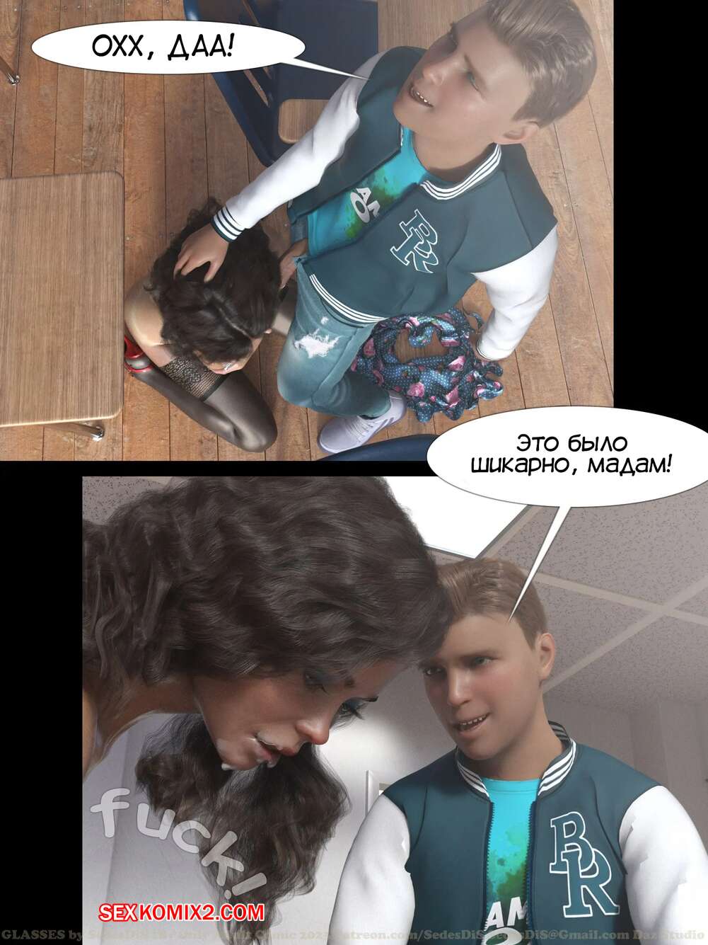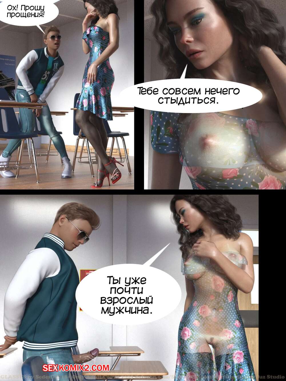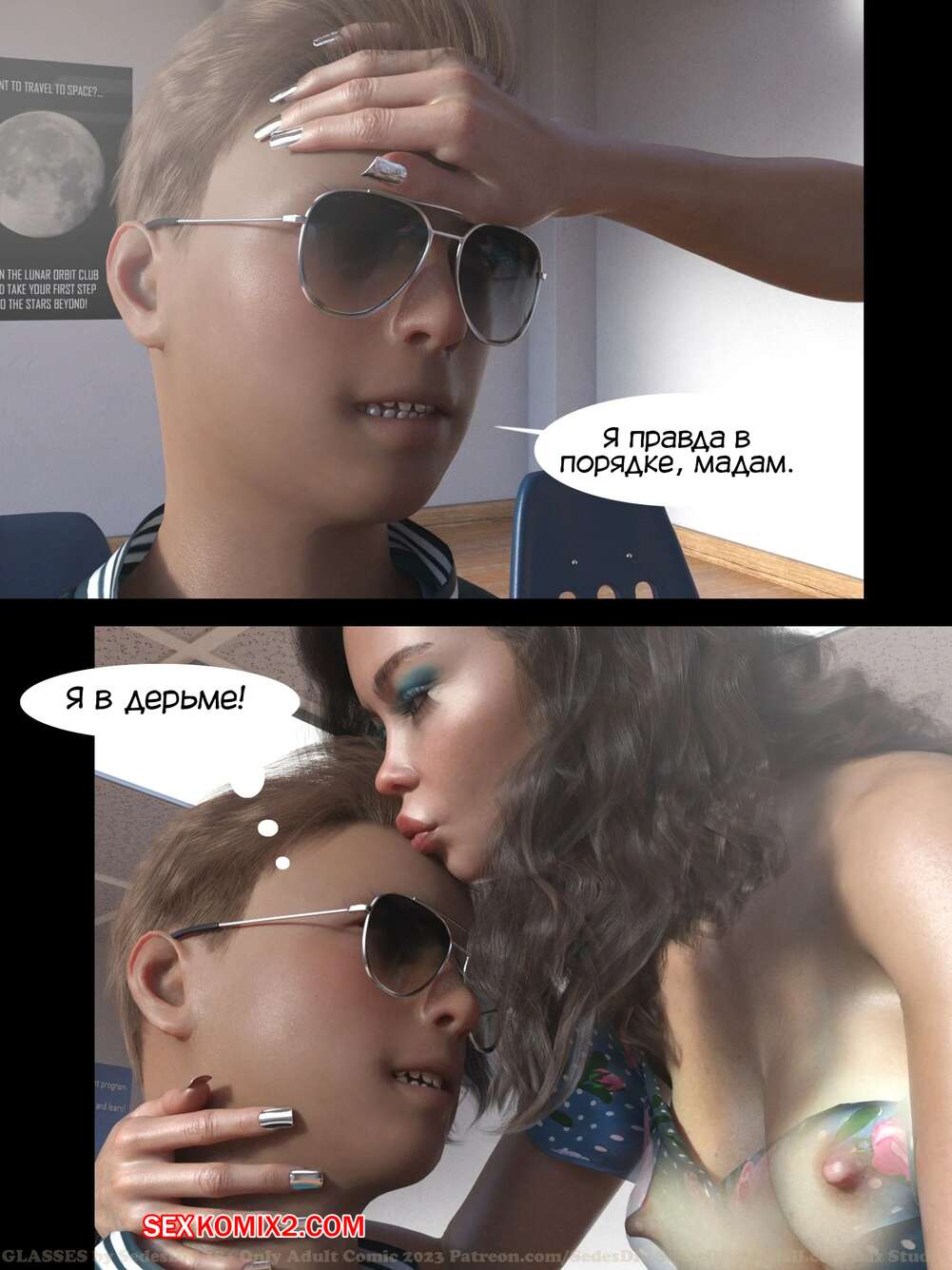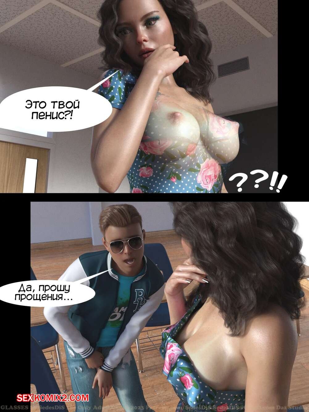 Порно комикс Очки. Часть 1. Glasses. SedesDiS. Парень остался после уроков у сексуальной училки и стал на нее смотреть в очках, которые позволили ему увидеть красокту голой. Училка спалила стояк парня, от чего она возбудилась и дала парню себя выебать.
