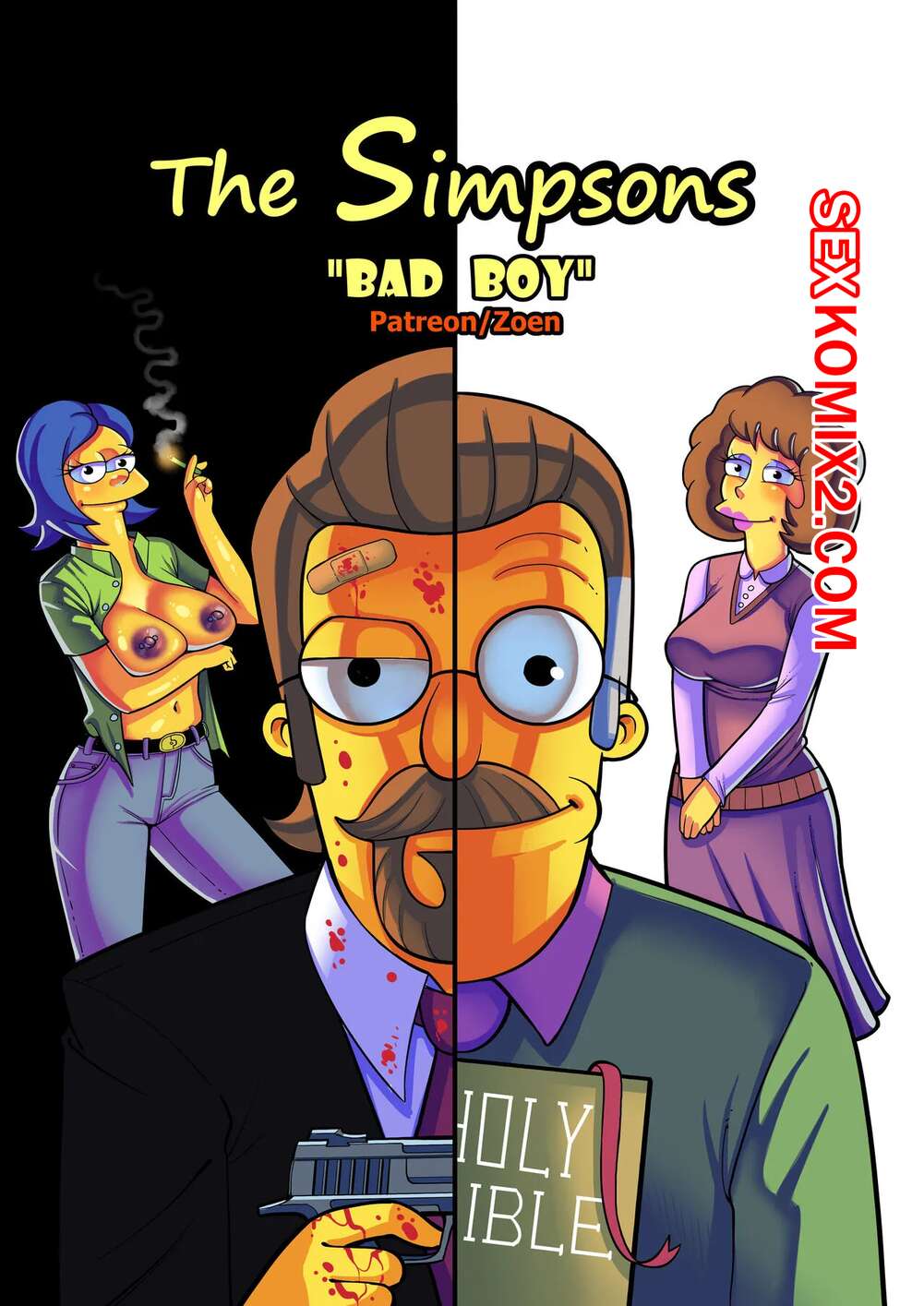 Порно комикс Симпсоны. Плохой парень. Bad Boy. Zoen Нэд проснулся в постели со своей сексуальной женой. Пока милфа спала голой, он стал рассказывать о своем детстве, чтобы поведать каким плохим парнем он был и как достиг такой шикарной женщины.