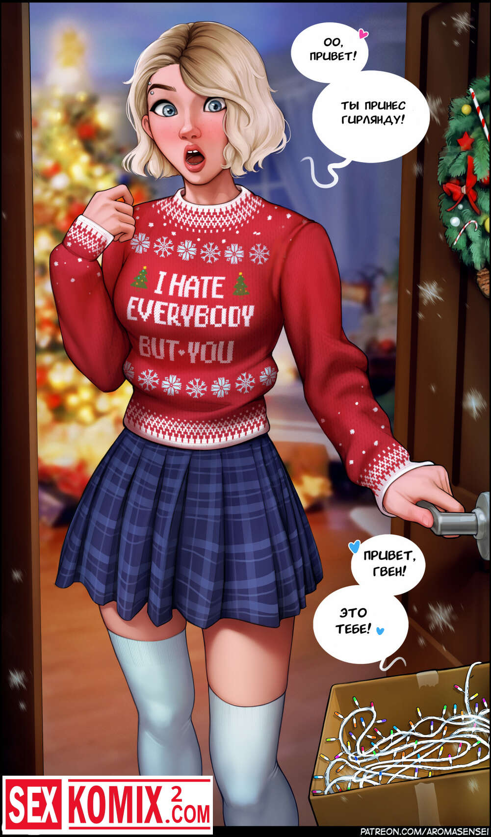 Порно комикс Гвен Стейси. Gwen. Парень пришел в гости к аппетитной блондинке и принес гирлянду. Девушка была польщена его вниманием и позволила себя выебать.