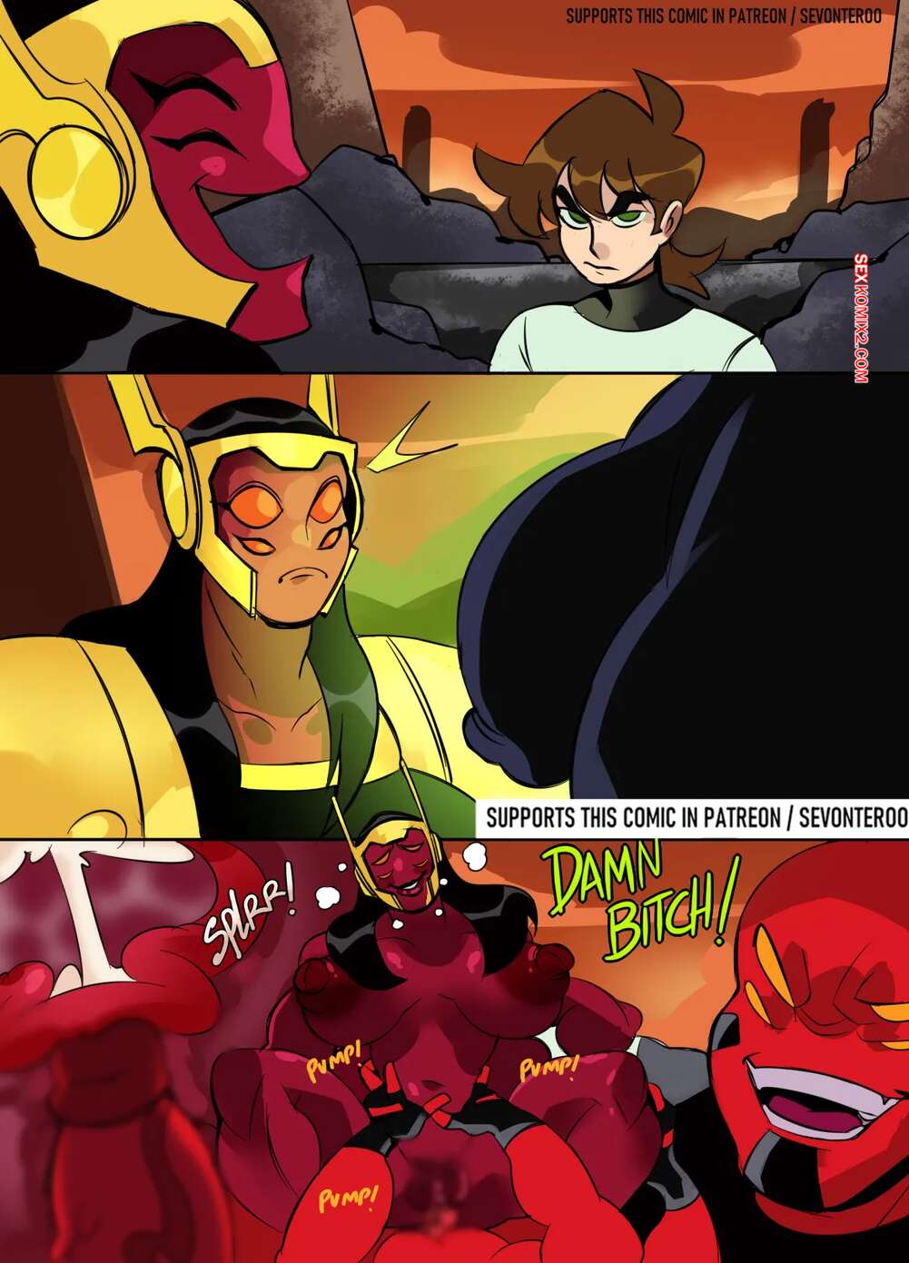 Порно комикс Бен 10. Инопланетная силая. Alien Force. Sevonteroo Горячие красотки без ума от большого члена Бена. Девушки раздеваются и раздвигаются ножки перед парнем, после чего дают ему себя хорошенько выебать, получая огромное удовольствие.