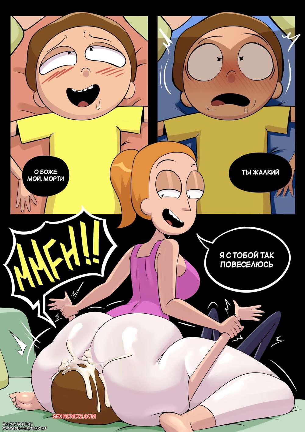 Порно комикс Рик и Морти. Rick and Morty. Spakka5. Красотка Саммер отправилась в комнату к Морти, желая пошалить. Красотка сняла трусики и возбудила брата, после чего раздвинула ножки и дала себя оттрахать.