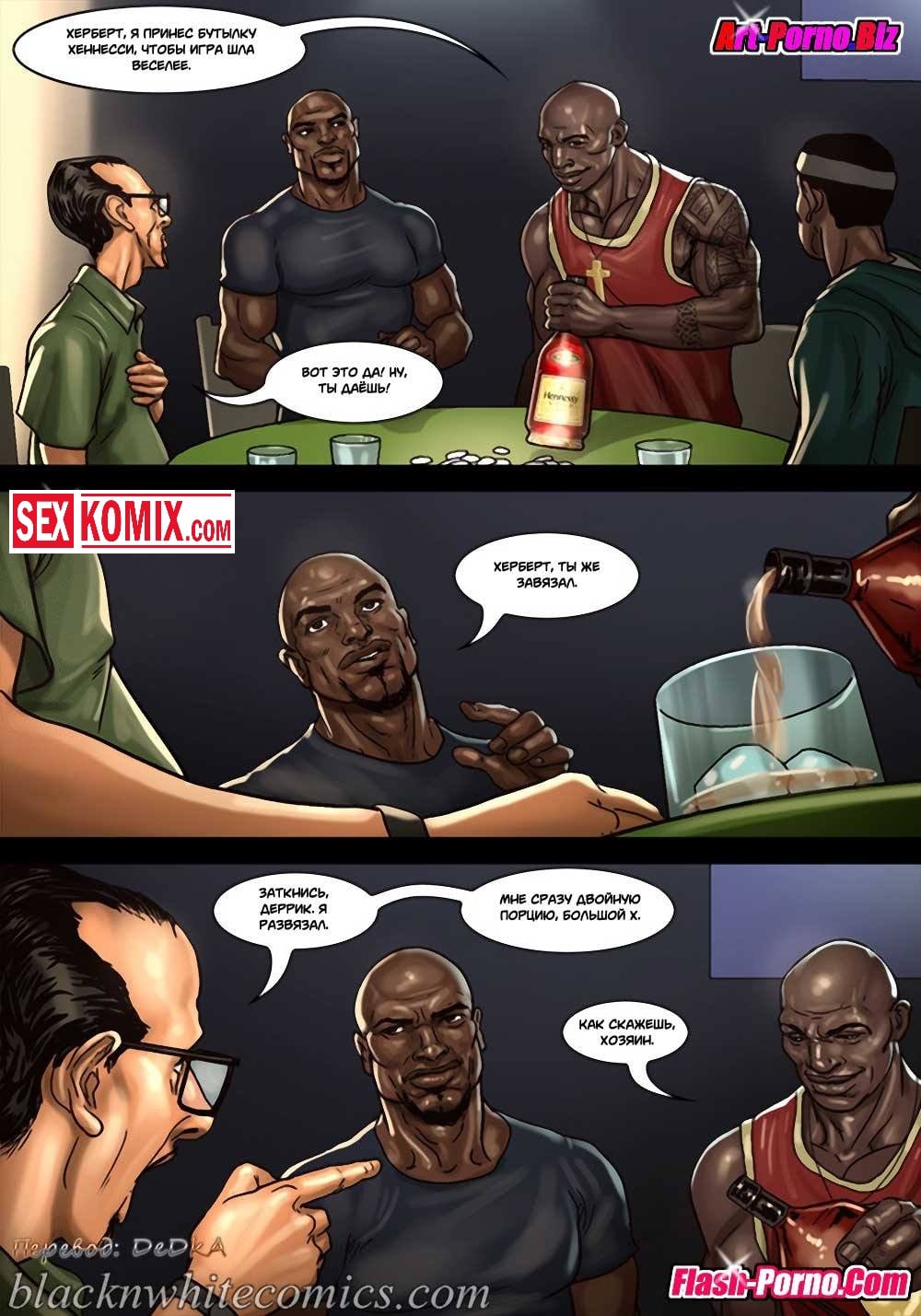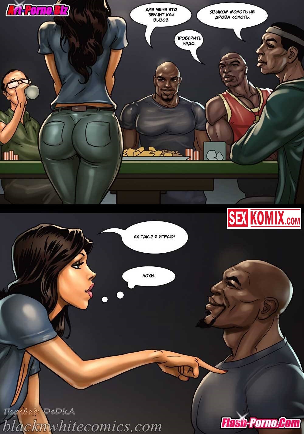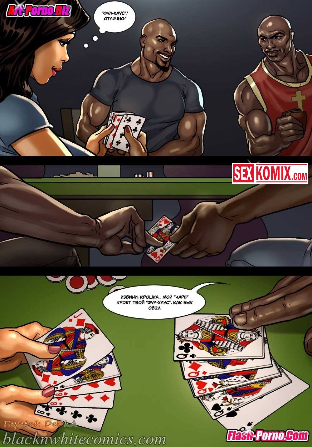 Порно комикс Игра в покер. Часть 2. Покер гейм. Ставки повышаются. После того как простой парень играл в покер с чернокожими ребятами, он очень сильно задолжал. И чтобы отыграться они устроили новую партию у него дома. Во время игры мужчина снова стал проигрывать, и чтобы разрядить обстановку к ним пришла жена проигравшего. Она очень сексуальная девушка с большими сиськами, чернокожие парни сразу обратили на неё внимание и захотели её трахнуть. Именно для этого она туда и пришла, после того как они уже занимались горячим сексом, к ним пришла ещё и её подруга и стало еще веселей.