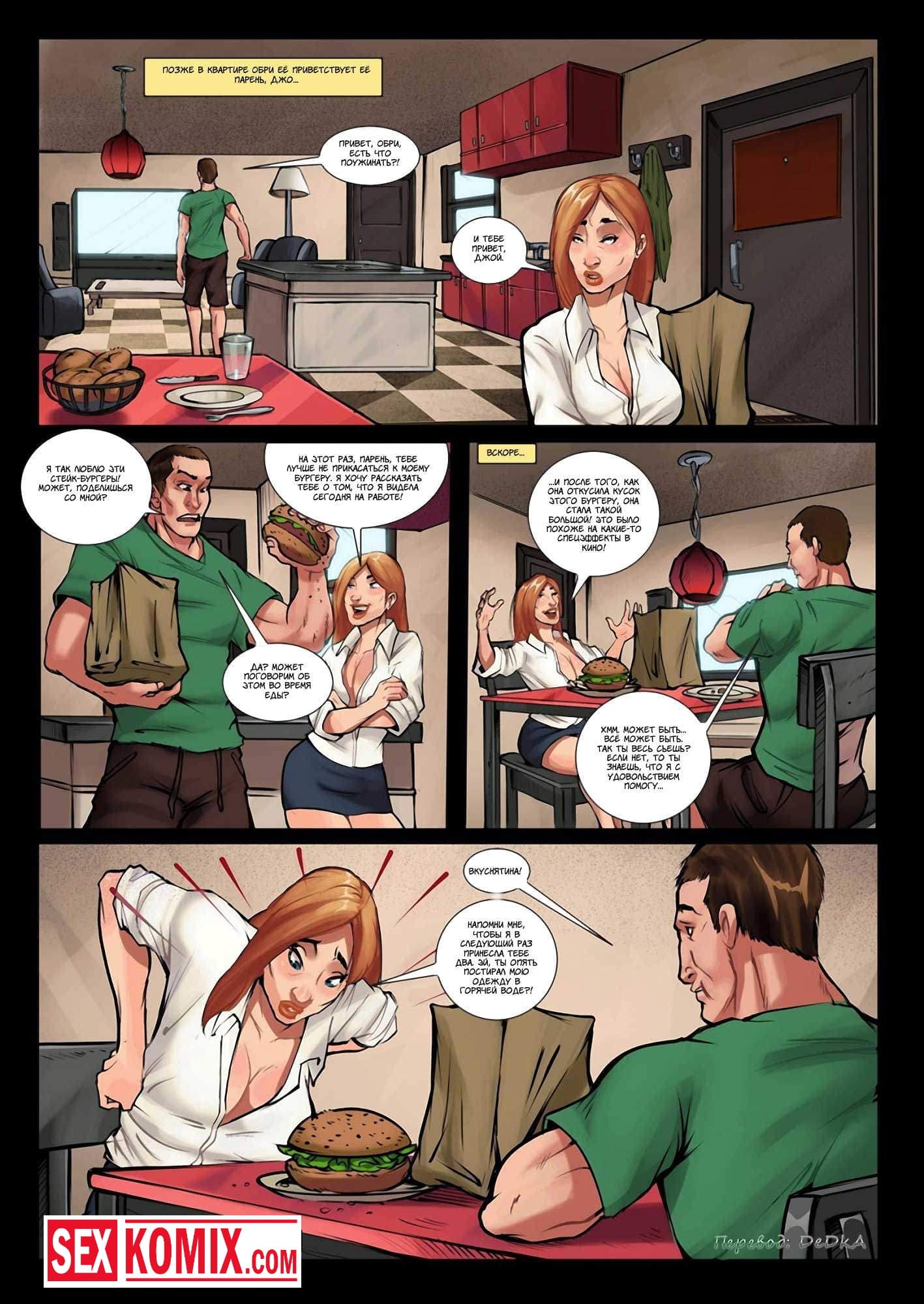 Порно комикс Только не мясо. Часть 2. Парень познакомился c симпатичной девушкой и узнал о том? что у нее аллергия на мясо/ После того как она его съедает? ее тело начинает расти? f сиськи и задница становится очень сочными и большими, но девушке такая метаморфоза не очень нравится, поэтому она старается его не кушать. Так как парню понравилось заниматься сексом с ней, когда девушка вырастает, он специально в виду подмешивает ей мясо, чтобы она росла.